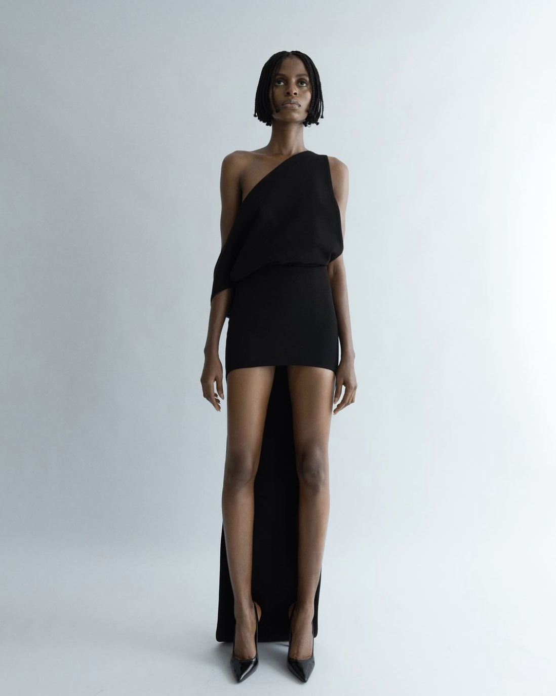 The brand leads with strong silhouette as a guiding principle and immaculate tailoring as a foundation — for example in Look 4, from the front, the one-shoulder gown has a shortened hem and elongated train in the same material; but from the back, the peek-a-boo of royal blue interior lining is an unexpected element of playfulness in what could otherwise be seen as a pretty classic look.