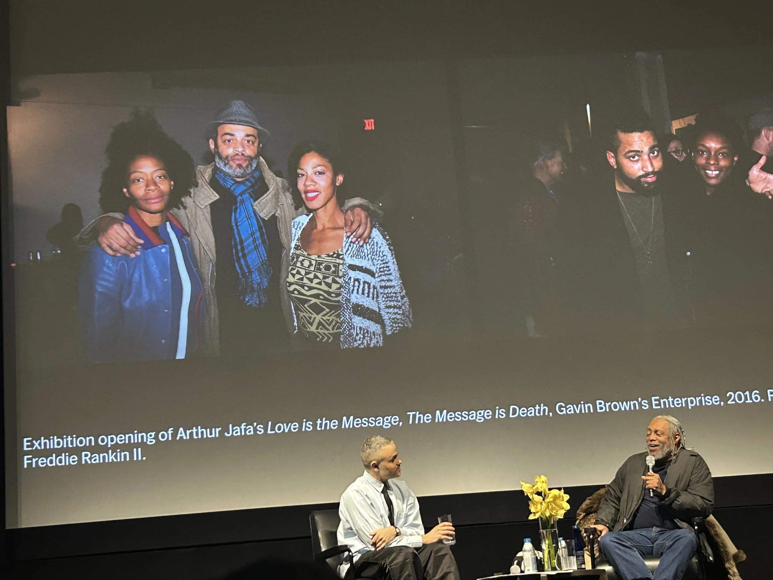Jafa repeatedly shared anecdotes of his own personal history, in the time before he considered himself an artist with a capital A, and how the experience of witnessing art of his future peers shaped him. His tongue in cheek humor and referential-heavy manner were on full display, as he wove comparative analyses of James Brown and Bob Dylan, the totemic contribution of the Gee’s Bend quilting tradition to the modern abstraction movement, and the nature of sociality on the ‘assigned vs inherent’ value of art. Each topic could have been a lecture in and of itself. At one point, he mused about his own formally coming to terms with being an artist with “how can you call it a practice if you don’t do it regularly?” Amidst audience laughter, his candor underlined a posture of freedom for someone who has long-existed on the periphery of an industry he is now firmly a part of.